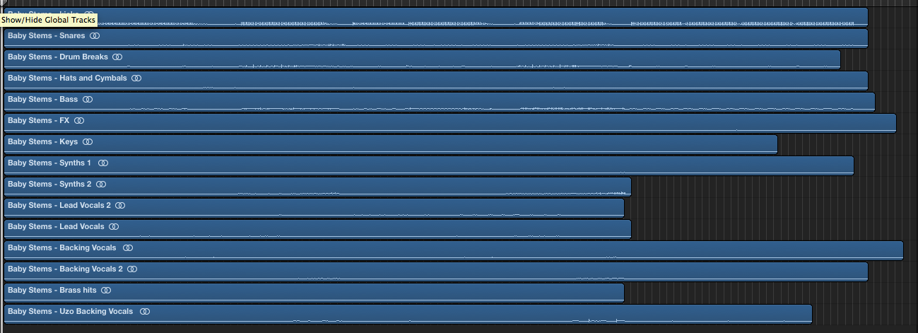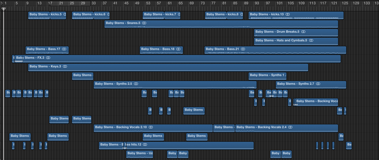 This is what it looked like when I’d imported it into my Logic software. Each of the lines represents one instrument or a vocal.